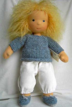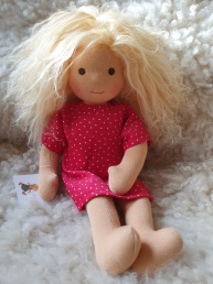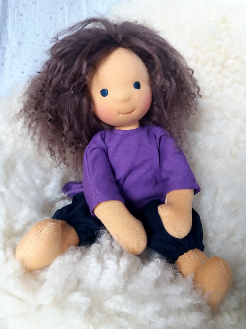 Material: Der Puppenkörper besteht aus Schweizer Qualitätspuppentrikot aus Baumwolle, das Füllmaterial aus feiner Bioschafwolle oder bei Bedarf
