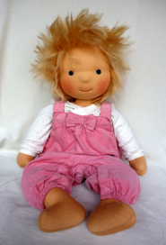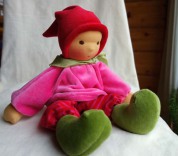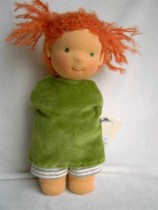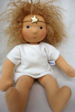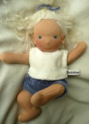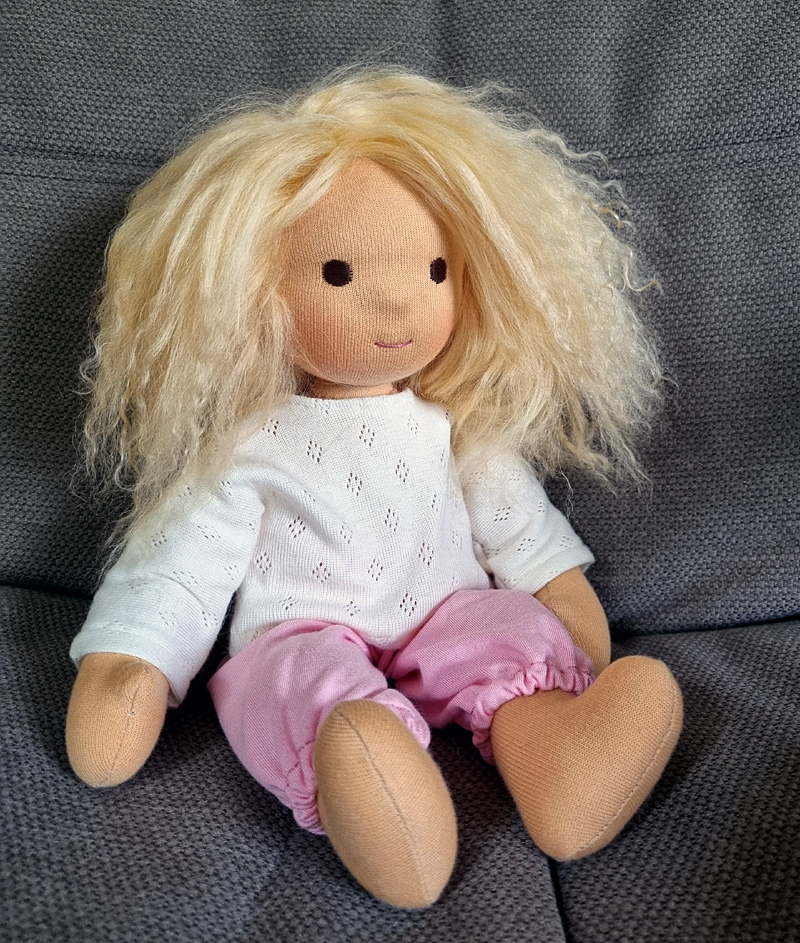 Material: Der Puppenkörper besteht aus Schweizer Qualitätspuppentrikot aus Baumwolle, das Füllmaterial aus feiner Bioschafwolle oder bei Bedarf